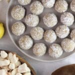A plate of coconut baobab balls on the table, a healthy snack made with baobab powder.