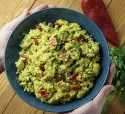 Delicious one pot chicken curry and rice with chicken thighs, bell peppers, coconut milk and spices.