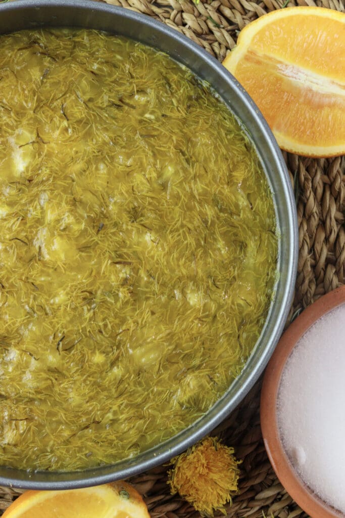 - In a small pot, heat the orange juice with half of the sugar over medium heat (don’t let it boil). Add the dandelion petals and simmer for about 2 minutes. Stir in the chopped oranges.
