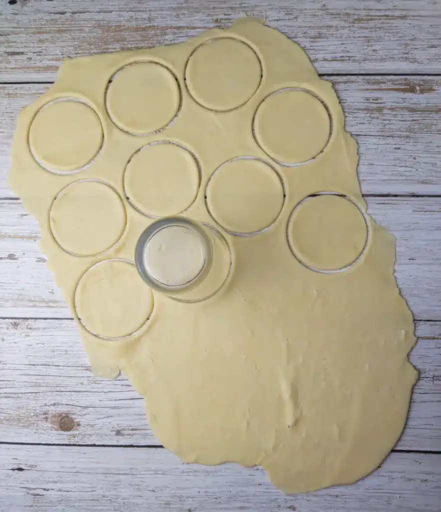 - With a cookie cutter or an empty glass (diameter of about 7 cm) cut round discs from the dough. Knead the leftover of the dough again and make another batch of the discs and repeat until you have any dough left.