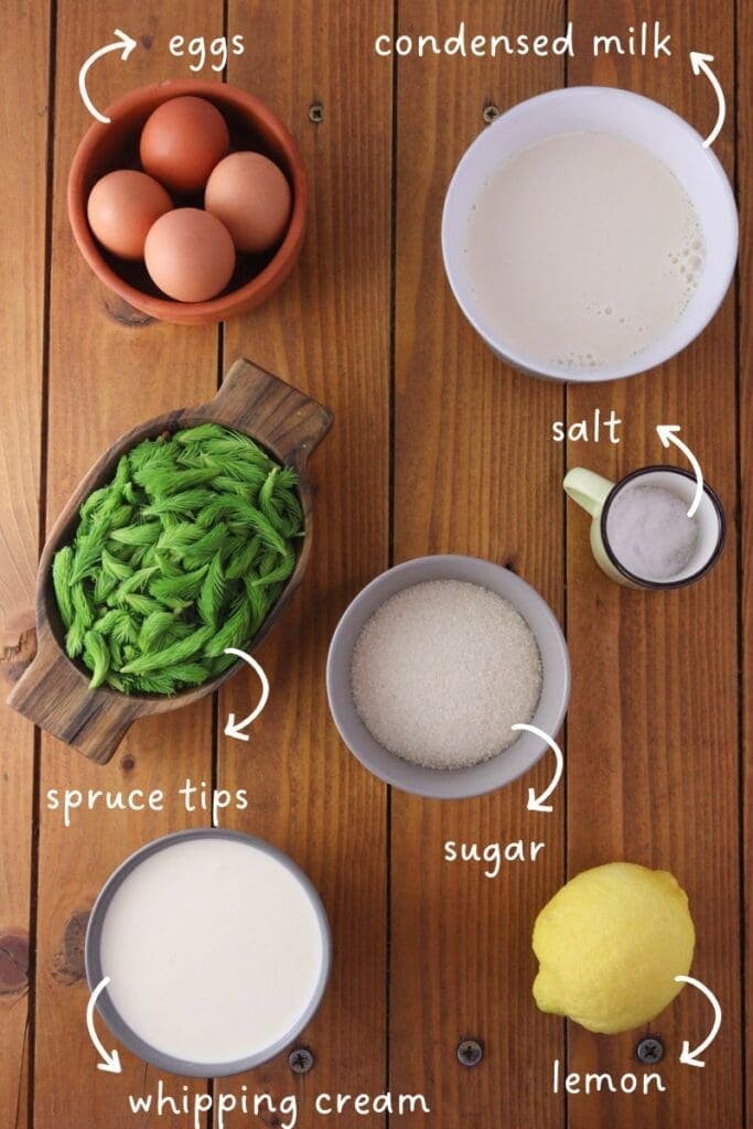 Spruce tip ice cream has a fresh, bright flavor that’s hard to describe until you try it – but with a sweet, creamy finish. It doesn’t taste like a Christmas tree (don’t worry!), but rather like something very refreshing, with a light, green note that’s paired beautifully with the richness of condensed milk and whipping cream.