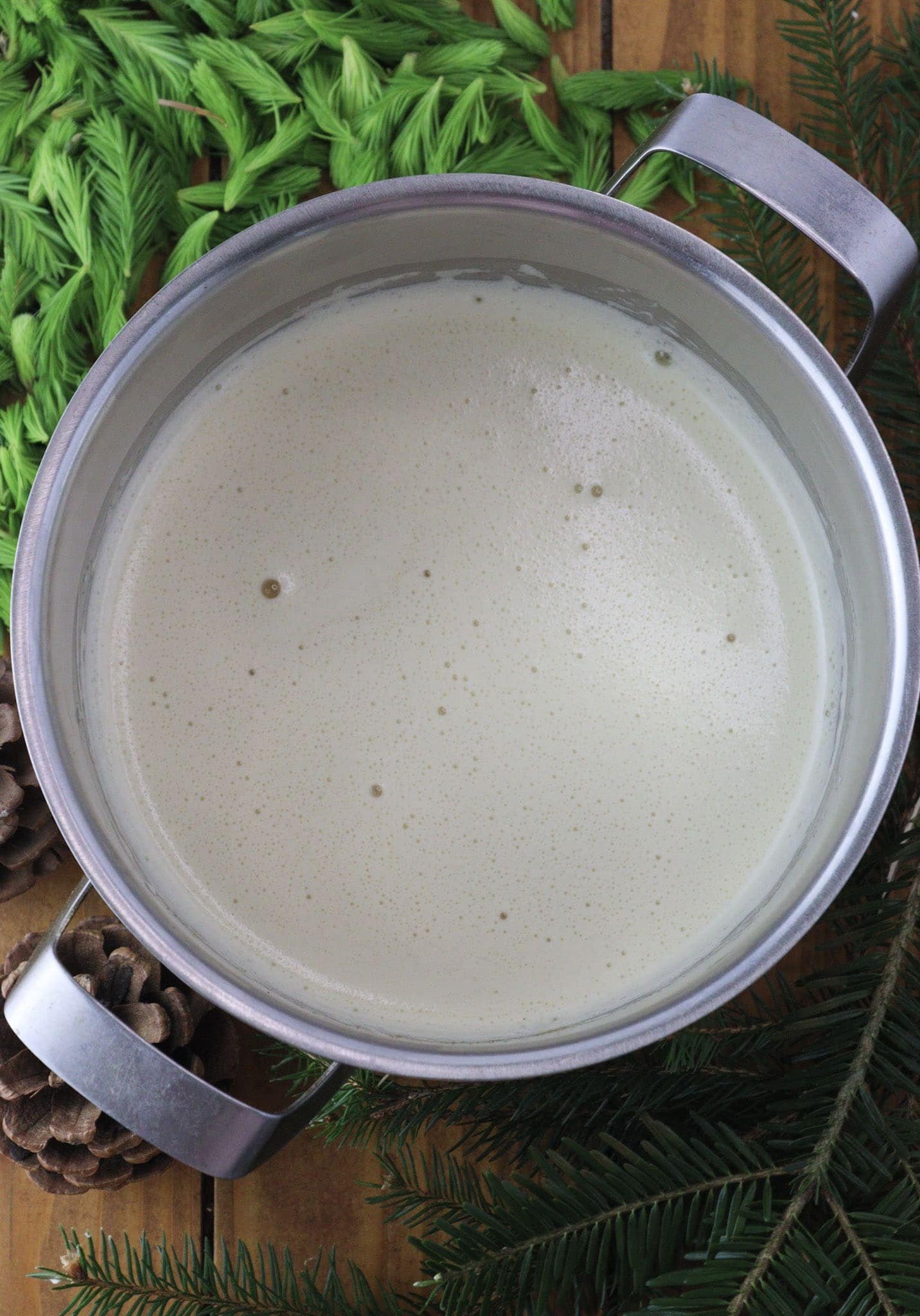 You can infuse the milk with other foraged or garden herbs such as mint, lemon balm, or elderflower for extra flavor. A splash of citrus or a handful of fruit—like pomegranate seeds or fresh berries adds a bright twist and pairs nicely with the spruce.