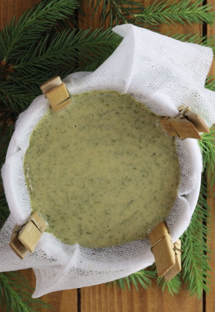 - Strain out any remaining spruce bits using clean gauze, cheesecloth, or a fine sieve. The mixture will be much thicker now and a nice foresty green.