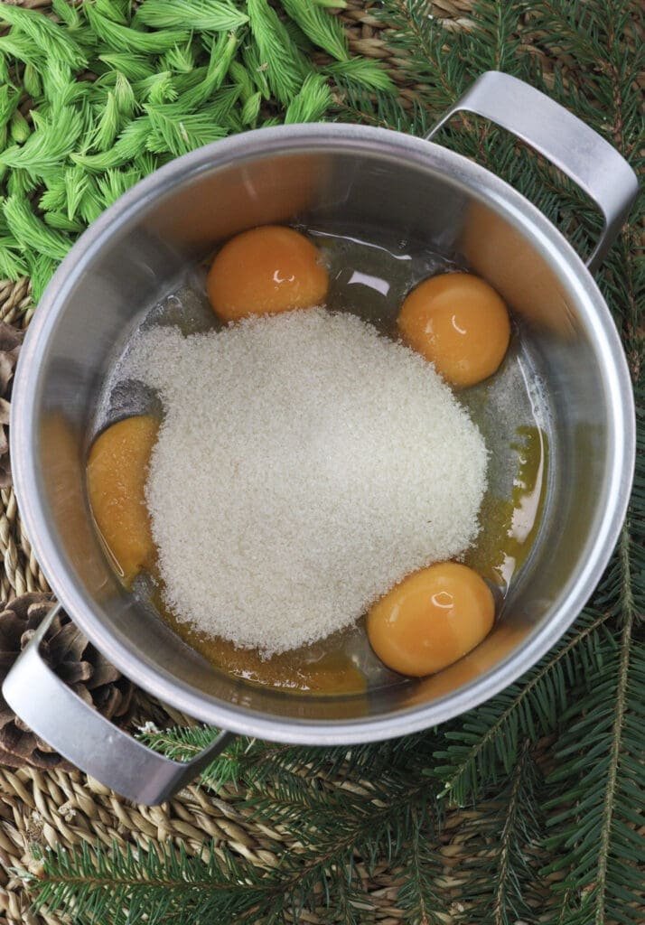 STEP 3: Let the mixture chill in the fridge for at least 24 hours so it can soak up all the spruce tip flavor. The egg yolks will thicken it, and you’ll notice it turns a deeper green by the next day. We tried leaving it even longer — and the flavor just keeps getting better.