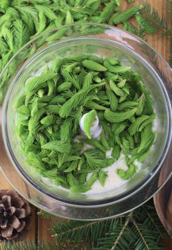 Blend the mixture well. Spruce tips need a good 2–3 minute blend to really break down and release their flavor. A high-speed blender or food processor works best.