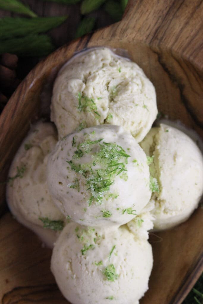 It sounds strange at first, but believe me – this ice cream is something else. The flavor is surprisingly good, it has just the right hint of citrusy spruce paired with creamy sweetness. You can top it with a sprinkle of spruce tip sugar, a drizzle of syrup, or even a bit of chocolate if you like. Those combinations will give your favorite store-bought ice cream a run for its money.