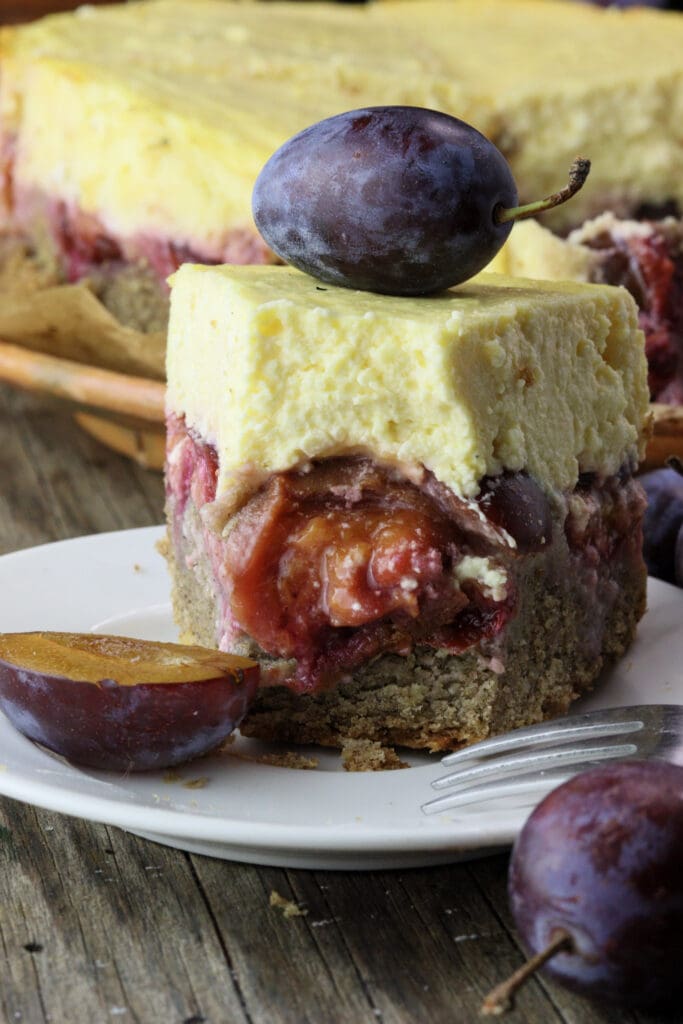 - Pour the cottage cheese mixture evenly over the plums. Bake for 35 minutes at 356°F / 180°C. Cover loosely with parchment if the top darkens too fast.