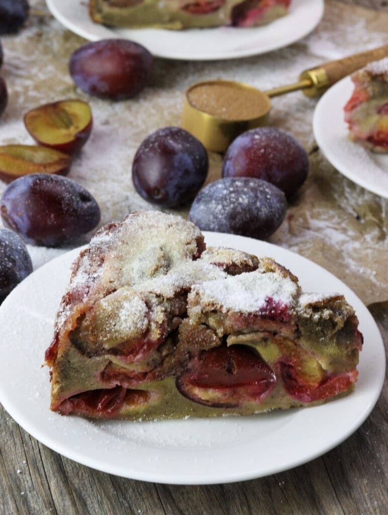 And that’s it – your gorgeously smelling buckwheat plum clafoutis is ready! We dusted ours with powdered sugar, but honestly, it’s just as good without. Or swap the sugar for a sprinkle of almond slices for a nutty crunch on top.