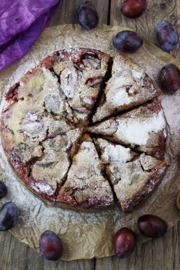 Absolutely keep the skins on! Plum skins melt into the batter and add flavor and color. If you really don’t like them, peel or blend the fruit first, but honestly, the rustic look is part of the charm.