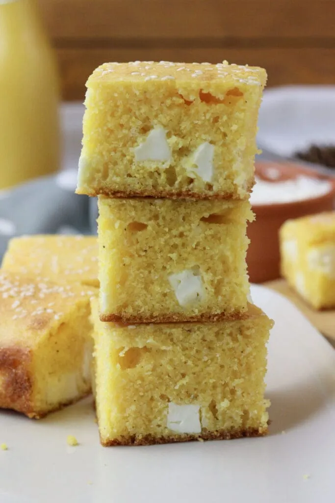 In this recipe, we replaced cornmeal with instant polenta (yes, you heard it right) for a moist, airy texture and added fresh white cheese to enhance the taste and make it richer.