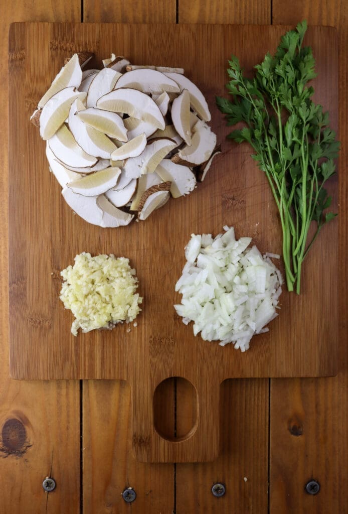STEP 1: Clean the porcini and remove any pine needles, leaves, or bits of forest debris. Don’t wash them, use a small brush or a clean towel instead. Slice the mushrooms, chop the onion, crush the garlic, and prepare a small bunch of parsley.