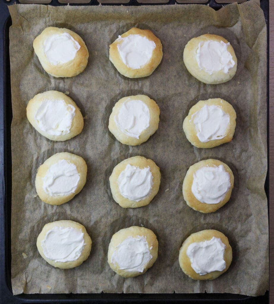 - Whip the cream, beat sugar and cream cheese. Add lemon juice and fold it gently together. Refrigerate until puff pastry is baked.