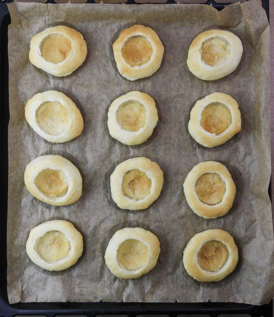 STEP 6: Bake the tarts at 410°F/210°C for 20 minutes until they are golden. While they are hot, press down the center to make space for the cream filling and fruits. Allow them to cool while you prepare another sheet of puff pastry.